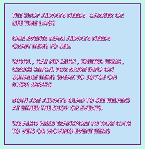 In 2004 a group of cat lovers set up a charity which would help the cats locally in whatever way we were able. Because of the work we do people have grown to learn that we will do whatever we can and so have supported us. When funds allow we run a free neutering campaign as we believe that each unwanted kitten takes a potential home from an adult cat and female cats will wander when they start ‘calling’. Males will be very territorial and fight intruders. Many of the injuries and infections are caused by bites, either fighting or mating. We have helped numerous people, when circumstances have forced considering giving up a loved pet, by helping arrange vet treatment if needed or supply food for an interim period. Many of these homes have contributed to our funds when circumstances improved which meant we could help others.Many cats which were to be PTS because of injuries, ailments or lack of finances to pay for vet treatment that we have heard of we’ve helped and either returned to their loving family or found a new home for them to recuperate. We try to collect any reported RTAs as soon as possible so the cat does not suffer and, where possible to inform the family to give them closure. We are restricted on how quickly we are able to respond by the availability of volunteers, so if you can help please contact us by one of the ways on the ‘contacts’ page.People support our work in many ways. Giving time is one way that we cannot get enough of. There is a wide range of help you can give. Good condition items for resale, either in our shop or on ebay, are always needed. Items such as food and litter can be arranged through our facebook page or dropped into our shop if you want to help that way.